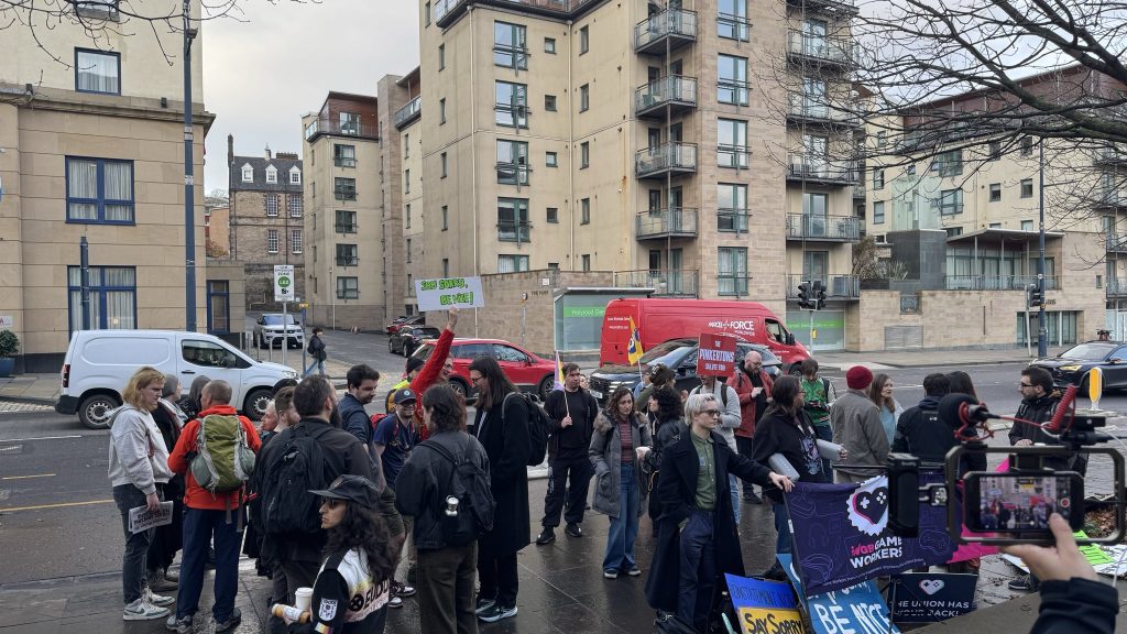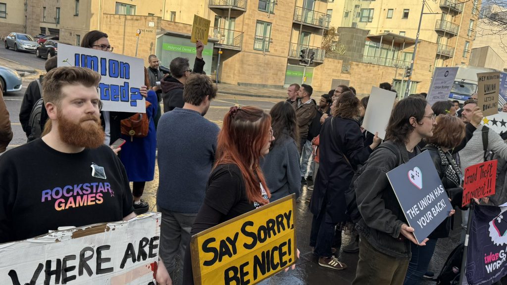 In the afternoon on November 6th, a crowd of people protested outside of Rockstar North’s office located at Barclay House in Edinburgh. Those in attendance included developers, union organisers, supporters and more. The gathering held signs and banners up high to spread the message to passers by. The protest initially was stated to last 1 hour but it ended up being more than 2 hours.