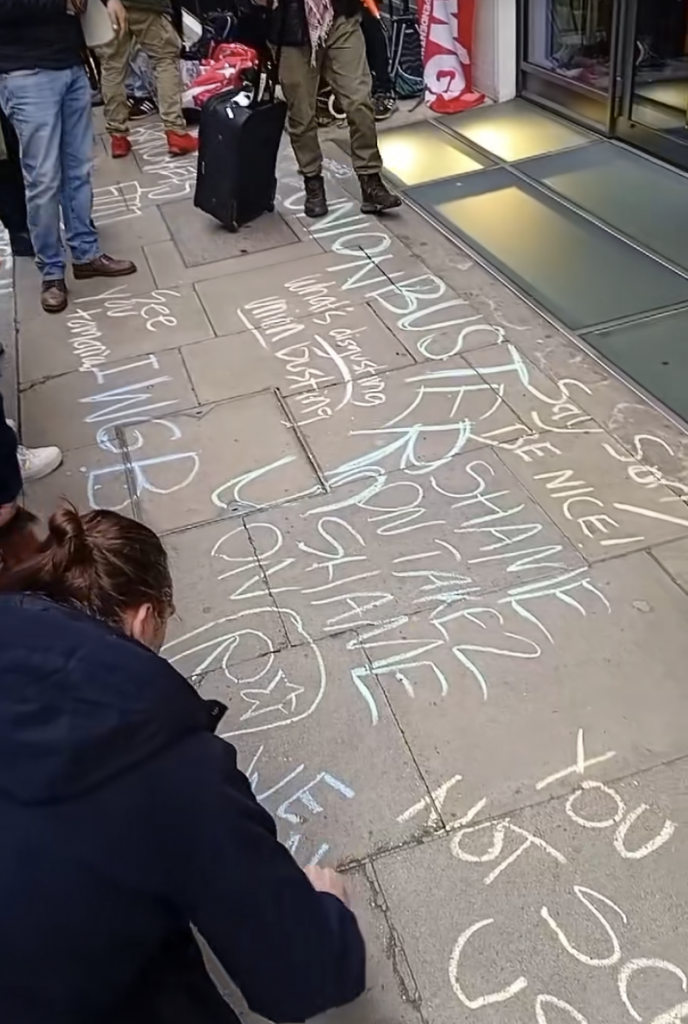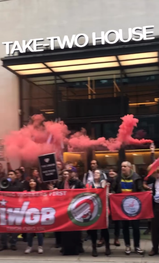 Earlier this morning, the IWGB held a protest outside of Take-Two’s London office. Despite a small crowd, there was plenty of activity and noise. Employee statements were read on megaphones as flares filled the air with smoke. The pavement right outside the front entrance to the office was covered in chalk-written messages.