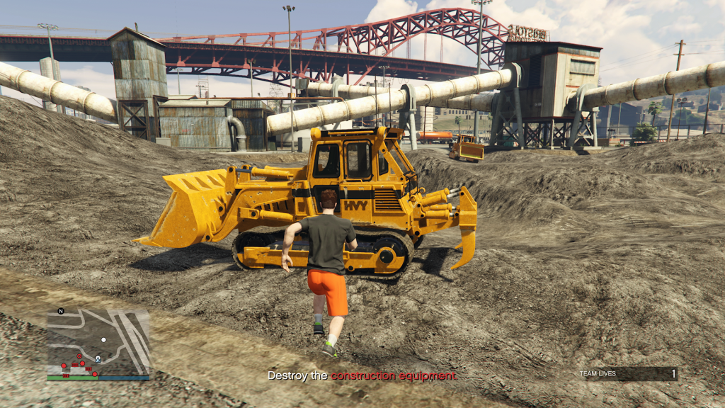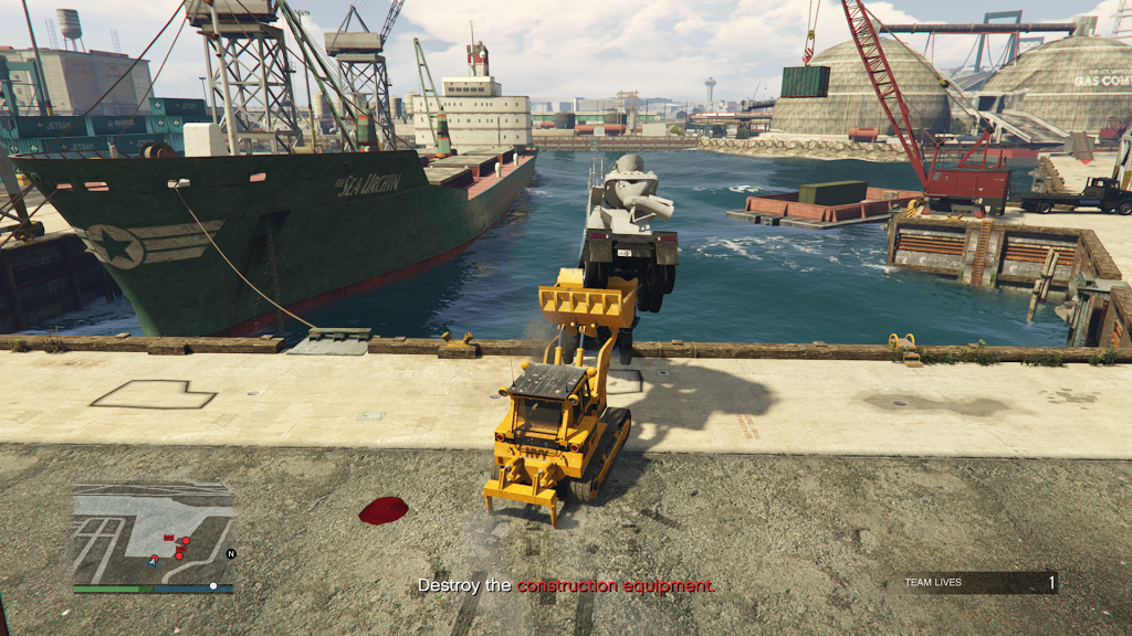Your destination is the port within Elysian Island. When you reach it, you need to destroy various types of construction equipment. Using a gun or explosive will cause you to miss out on a cash bonus so take a bulldozer and push them all into the water one by one. Construction workers will attack you so use melee weapons to take them out.