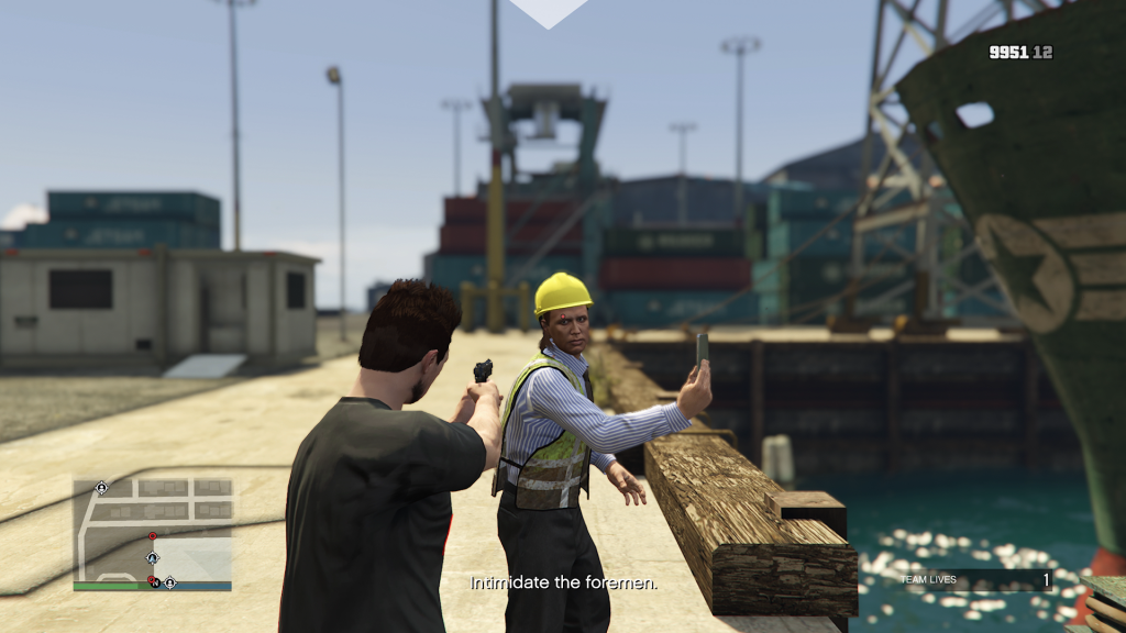 When all of the targets have been destroyed, 3 foremans will arrive on the scene and start taking photos. Intimate them by drawing a firearm on them. This will not affect your cash bonus. Just don’t shoot them. When they have been intimated, they will run away. After all 3 have been dealt with, leave the area but expect a police chase. Losing the cops will end the mission successfully.