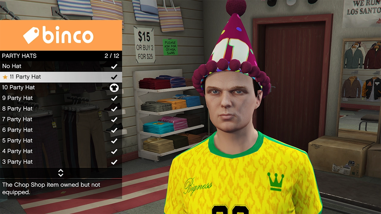 We did get confirmation of 13 through 15 year party hats thanks to a glitch. Twitter user Finn Pup said “For some reason my OG character has 15 of them. I guess by mistake. So looks like Rockstar is planning on supporting GTA Online for at least 5 more years.” Below you can see Hat 15 being worn with the other three in the list.
