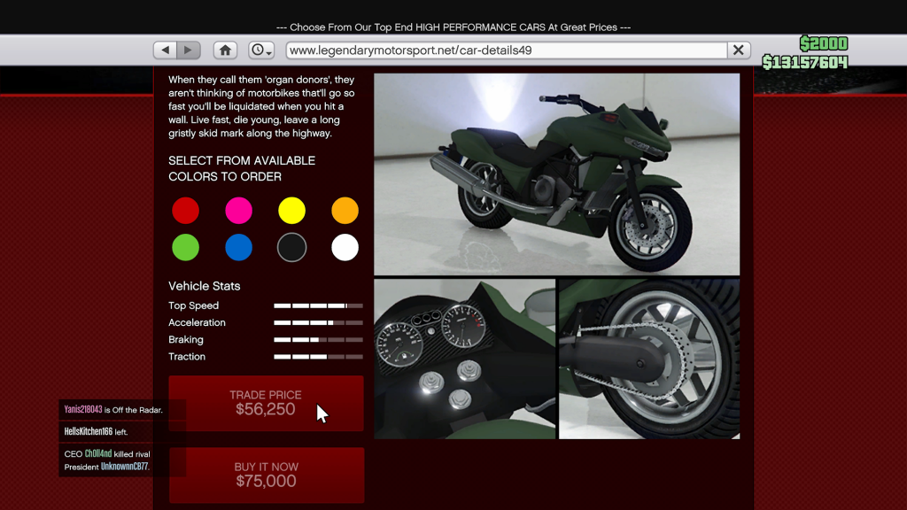 The Dinka Thrust can now be purchased once again in GTA Online. It came to the game as part of The High Life update for $75,000 at Legendary Motorsport. Rockstar removed it from being purchasable some time back. Now you can buy it at a trade price of $56,250. You earn this price by completing 10 Paper Route deliveries.