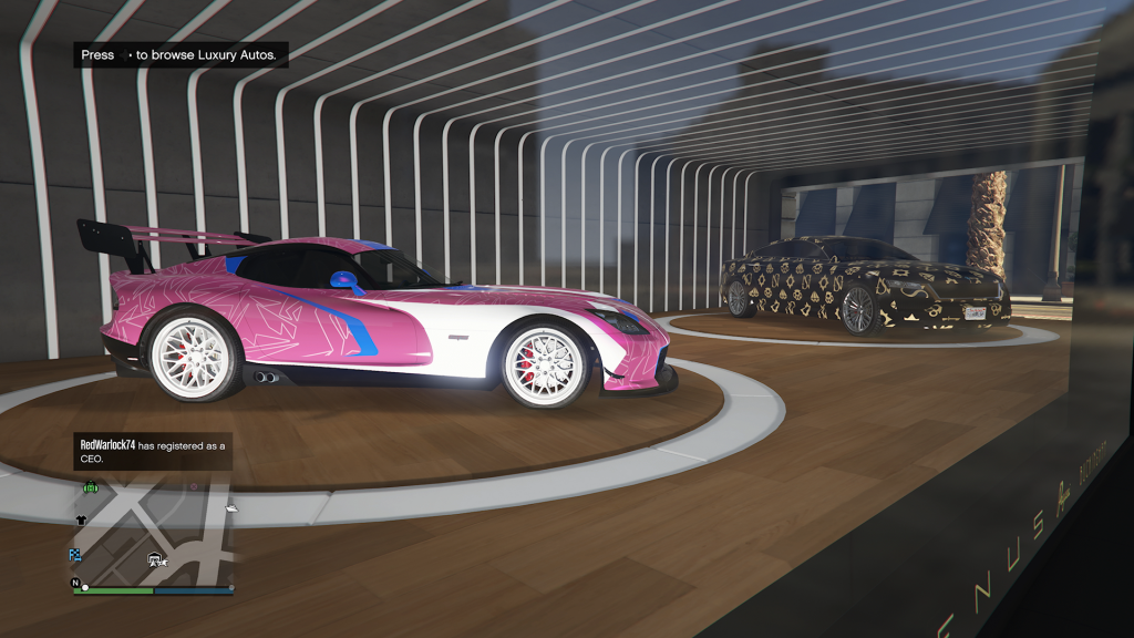 The GTA Online Luxury Autos Car Dealership located in Rockford Hills has two cars on show for purchase. The cars this week are the Bravado Banshee GTS & Übermacht Revolter with the Sessanta Nove Monogram livery.