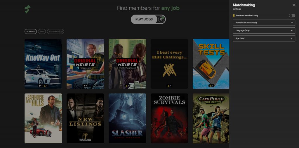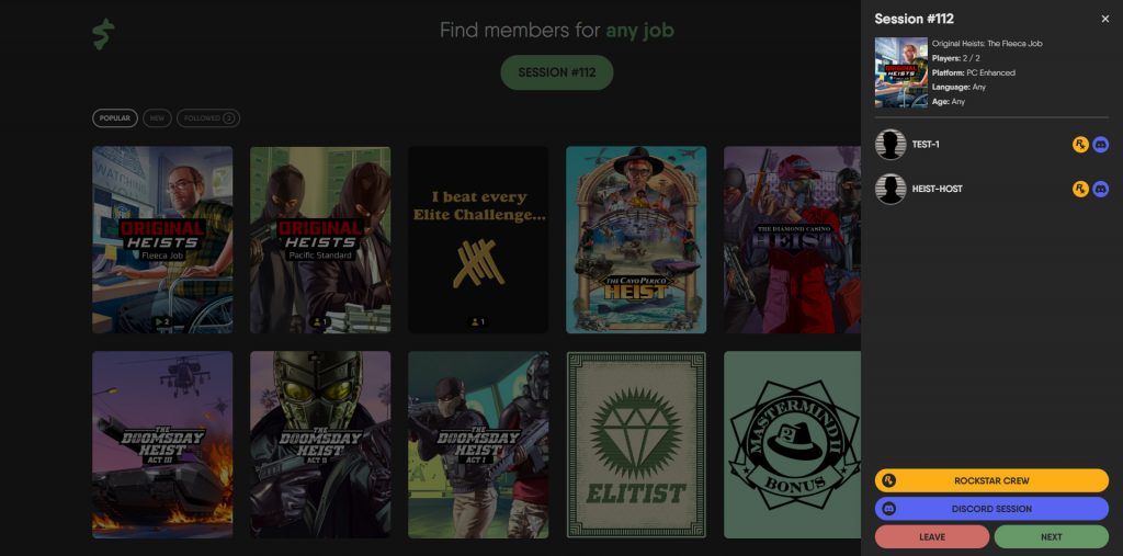 Now you can select any GTA Online job that need a minimum of 2 players to start. You can scroll the list, type into a search bar or use filters. Each job can be “followed” giving you notifications in your browser, Discord or Telegram when players active sessions that meet your search criteria.