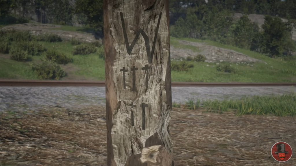 Following this, a 9th web was found by Redditor then2k02. This one can be found in the middle of the spider overlay on the map and is visible at 1am-2am. This central web is much larger and is in a tree. The model has a letter “N” and cross-like shape. This was assumed to mean North Telegraph pole and this was correct. Going directly north from this point to a telegraph pole and shooting it will reveal a carving underneath. The inscription reads ““W +++++”.