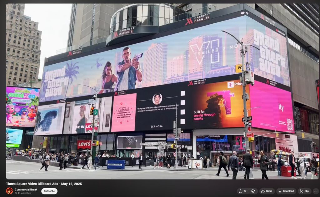 To be even more accurate, GTA YouTuber Gtamen found the advert appeared on the billboard during May 15th 2025. This is from a YouTube channel, Commercial Break, that chronicles the daily advert rotation of the main Times Square electronic billboard. Having looked through other days around May 15th, there are several ad spots by YouTube promoting other videos, not just GTA. You can see another angle of the billboard below.