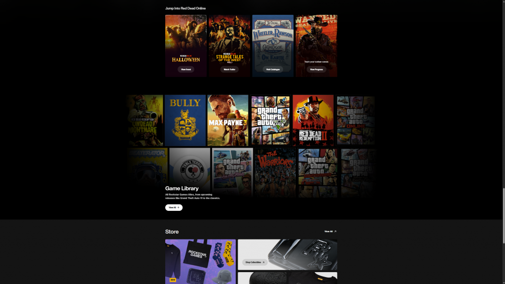 This is followed up by a Red Dead Online section that is basically the same as the GTAO one above it. The only difference is the content itself. Below this area is a display of Rockstar’s back catalog of games.