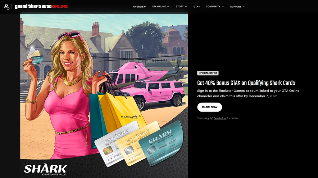 To take advantage of this offer, you must claim it on the GTA Online page on Rockstar Games’ website. Once you’ve got it open, you’ll see a section saying “Get 40% Bonus GTA$ on Qualifying Shark Cards” and a CLAIM NOW button as seen in the screenshot below. You need to have claimed this by 11:59 pm ET on December 7th 2025.